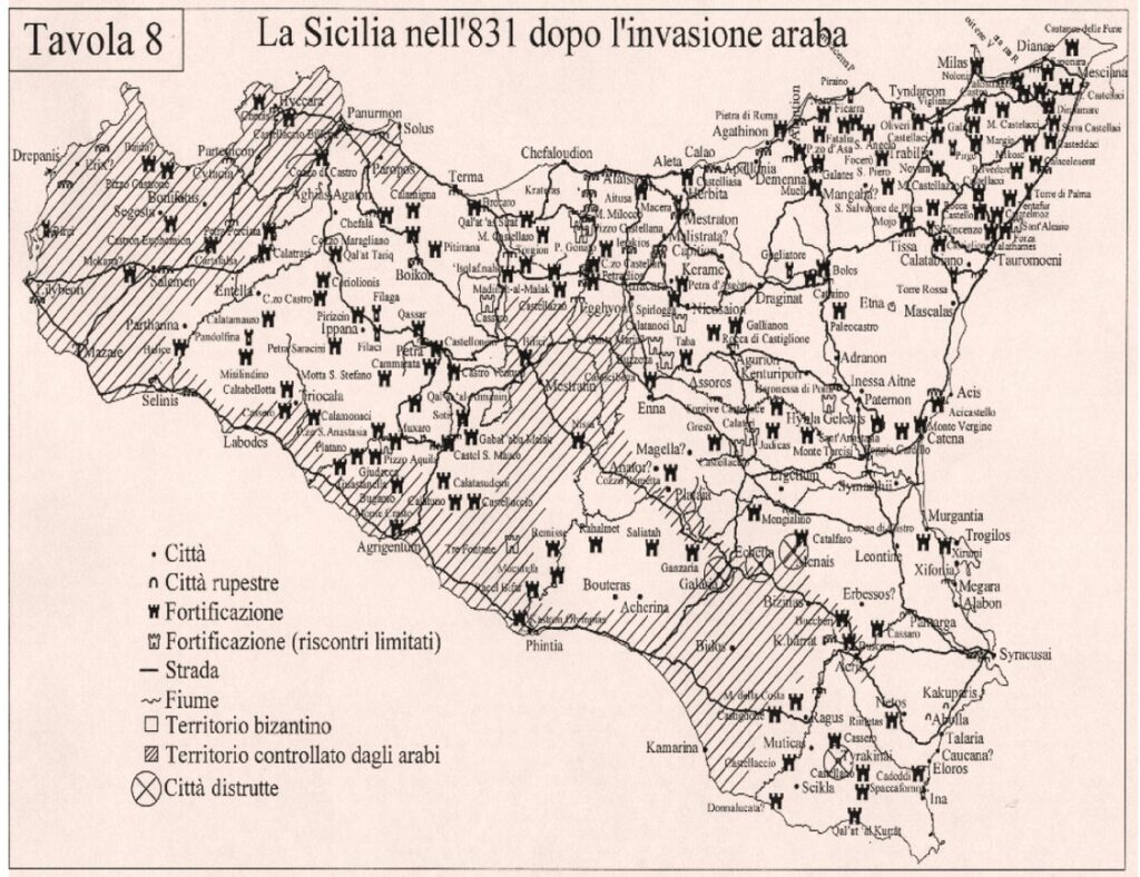 - 827–878 apr. J.C. — Résistances byzantines prolongées, jusqu’à la chute de Syracuse (878), qui marque la fin effective de la domination byzantine sur l’île.