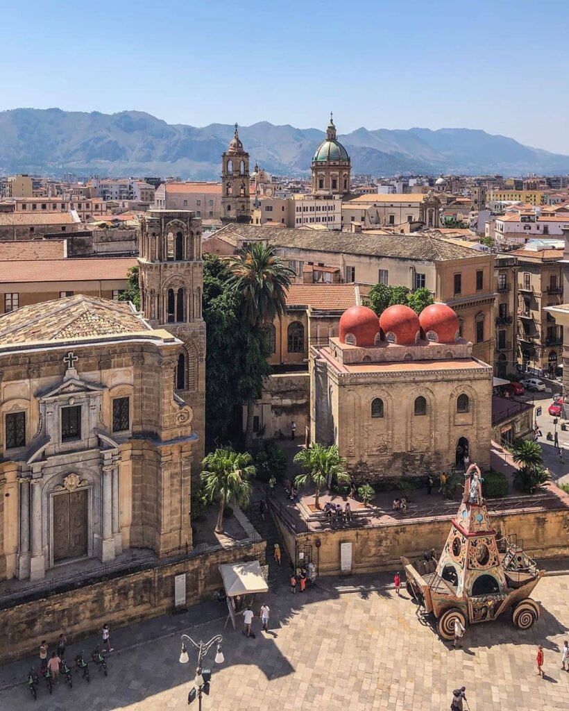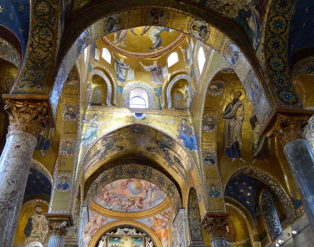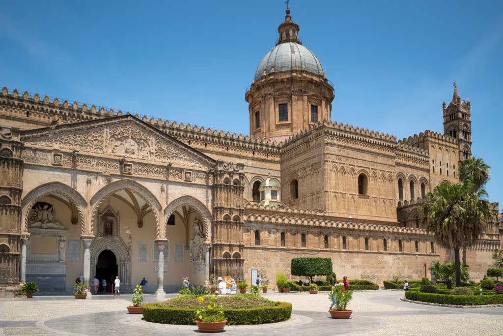 Monreale (près de Palerme) — Sa cathédrale (1174–1185) est l’un des chefs-d’œuvre de l’art normand en Sicile. L’extérieur sobre contraste avec l’intérieur couvert de mosaïques byzantines dorées, parmi lesquelles un immense Christ Pantocrator. Les cloîtres, avec leurs colonnes finement sculptées aux motifs géométriques et floraux, témoignent de la rencontre entre traditions arabes et normandes