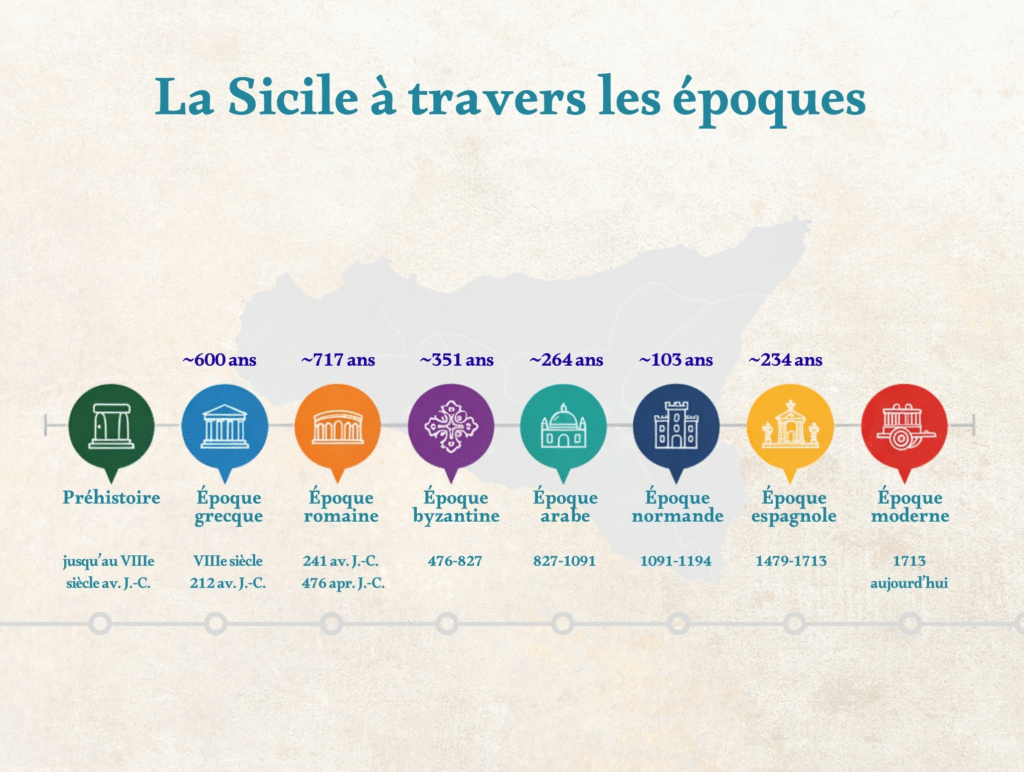 Faites défiler la page de haut en bas pour parcourir les grandes époques de la Sicile. Chaque période possède :